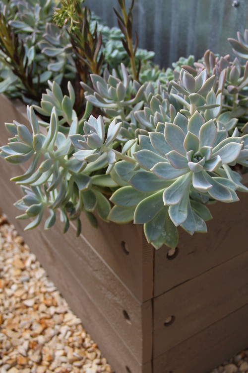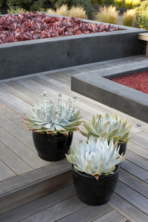 keperakan yang cantik jika ditanam di pot atau wadah berwarna gelap. Dudleya berwarna perak karena serbuk di