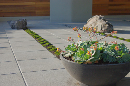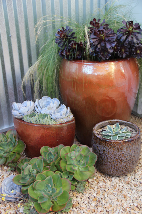 Berbagai jenis Aeonium yang tinggi bisa dimanfaatkan untuk menciptakan scene taman mini yang unik. Taman ini menggunakan jenis Aeonium arboreum berwarna gelap yang dikombinasikan dengan echeveria dan agave variegata.