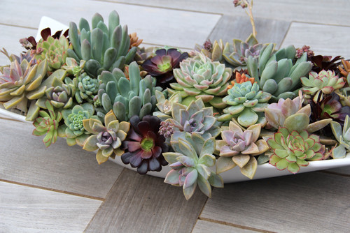 Jadikan sukulen sebagai centerpiece di atas meja, karena jika dibanding bunga potong, sukulen tahan lebih lama, bahkan hingga setahun. Gunakan pot yang pendek dan luas sehingga kamu bisa menanam berbagai macam sukulen. Pilih sukulen berukuran kecil seperti Echeveria, Sedum, atau Sempervivum.