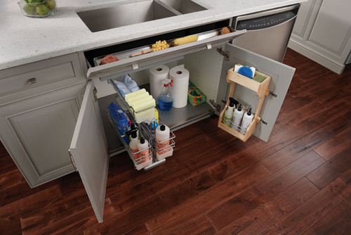 Ruang kosong yang ada di bawah tempat cucian piring biasanya tertutup dan digunakan untuk meletakkan alat-alat kebersihan seperti lap, sabun pel, cairan pembersih kloset, barang-barang yang lebih baik tersembunyi. Pertama-tama, keluarkan semuanya lalu bersihkan ruang tersembunyi ini. Kemudian masukkan kembali alat-alat yang sering kamu gunakan, yang masih utuh, dan masih bagus kondisinya. Singkirkan botol kosong, barang yang sudah kadaluarsa atau kotor. Sebisa mungkin kelompokkan barang tersebut sesuai materialnya agar mudah di daur ulang.